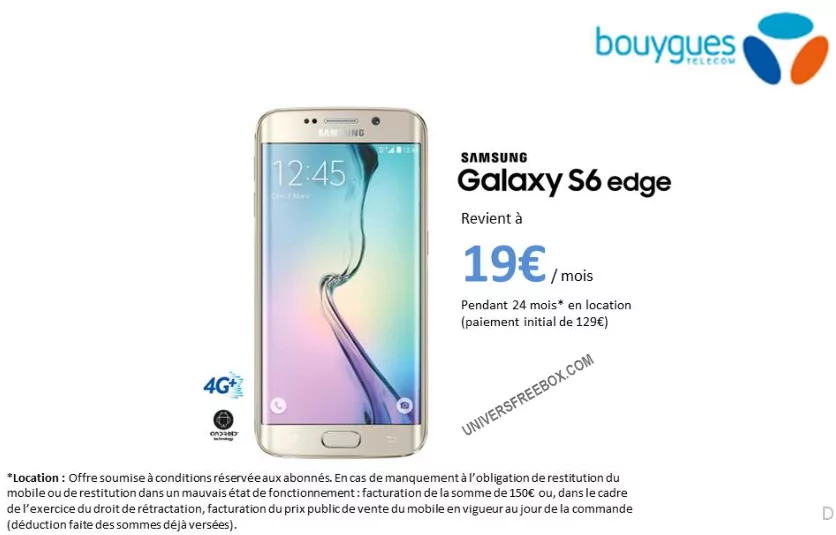 Chez Bouygues Télécom, si l’abonné conserve le mobile ou s’il le rend en mauvais état de fonctionnement après les 24 mois de location, il sera facturé à hauteur de 150 € pour le Samsung Galaxy S6 Edge (comme chez Free).
