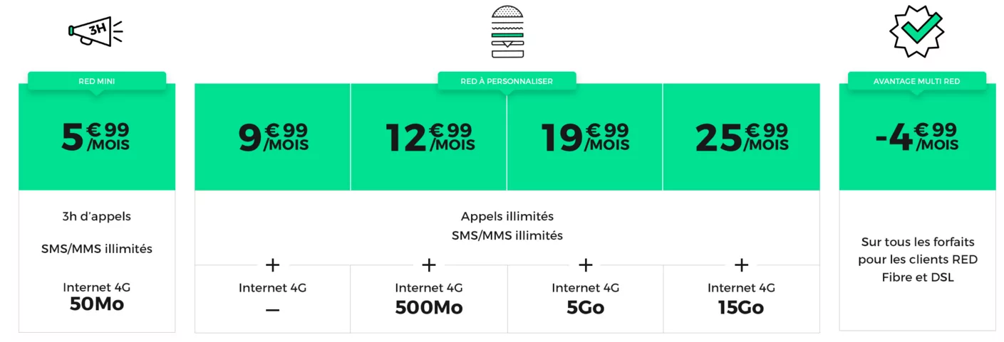 Accessibles à partir de 5,99€/mois, les nouveaux forfaits mobiles RED by SFR sont proposés avec des paliers de data pour les différents usages : 500Mo, 5Go, 15Go, avec appels, SMS, MMS illimités. RED by SFR continuera par ailleurs à proposer des offres fixes sans engagement et personnalisables, s’appuyant sur les réseaux THD et DSL de SFR.
