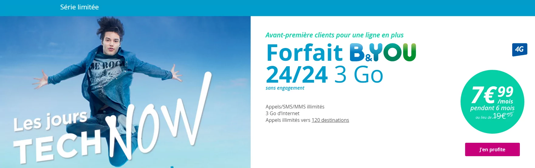 En revanche, la promotion n’est valable que 6 mois et uniquement pour un forfait supplémentaire. Proposé sous l’étiquette B&You, cette série limitée est réservée aux clients forfait ou box (à titre non pro) qui souscrivent un nouveau Forfait 3Go et plus.