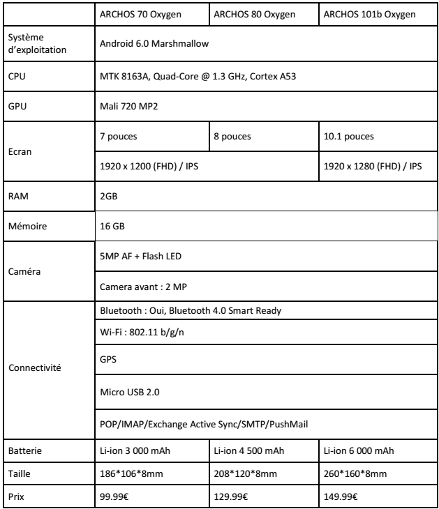 Le français Archos vient de dévoiler 3 nouvelles tablettes annoncées comme haut de gamme, avec écrans Full HD, aux formats 7, 8 et 10.1 pouces, processeurs quadri cœurs, 2 Go de RAM, Android 6.0. Présentées en avant-première au MWC 2016, les tablettes ARCHOS Oxygen seront commercialisées en mai 2016.