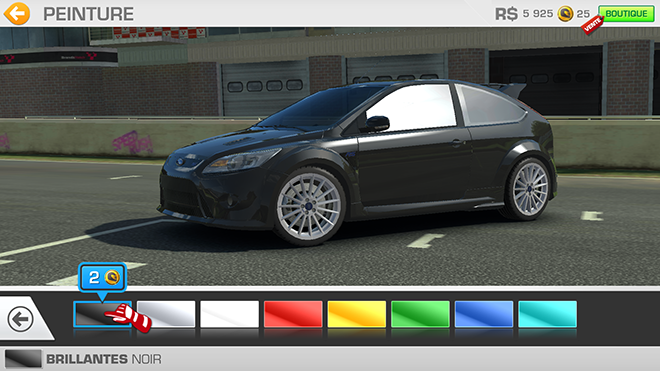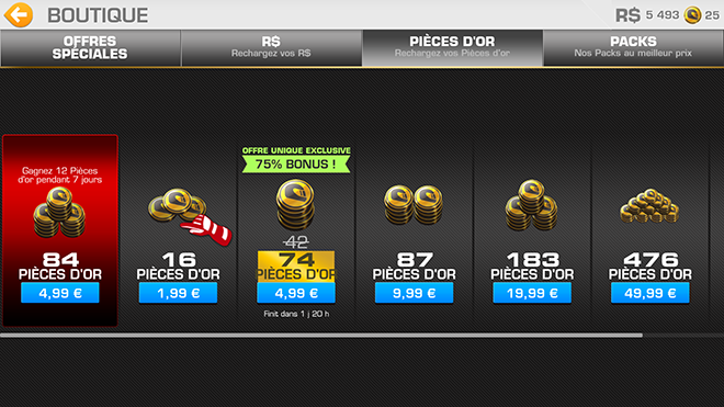 À chaque course remportée vous gagnerez de l’argent qui vous permettra par la suite d’acheter ou d’améliorer vos bolides. Vos véhicules auront aussi besoin de révision de temps en temps, ce qui vous coûtera aussi de l’argent. Les améliorations et les révisions demanderont du temps, vous pouvez aussi utiliser des pièces d’or pour que ce soit fait directement. Ces pièces d’or serviront aussi à la personnalisation cosmétique de vos voitures.