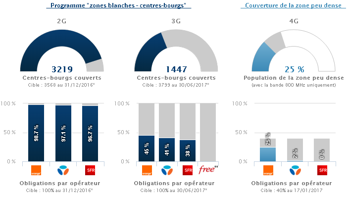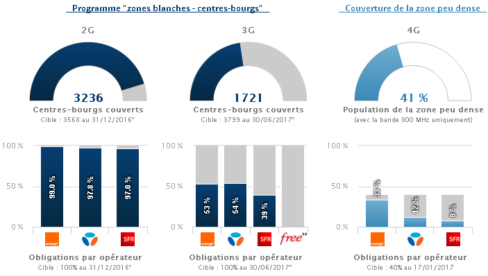 S’agissant de la 4G, les opérateurs titulaires de fréquences 4G en bande 800 MHz (Orange, Bouygues Telecom et SFR) sont tenus de couvrir, d’ici le 17 janvier 2017, avec la bande 800 MHz, 40% de la population de cette zone peu dense. Bouygues Télécom et SFR n’étant pas sur la bonne trajectoire pour parvenir à leur objectif, l’ARCEP les a mis en demeure de respecter leur échéance du 17 janvier 2017.