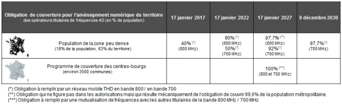 A noter que Free n’ayant pas de fréquence en bande 800 MHz, il n’est pas soumis à cette obligation. Il est en revanche tenu de couvrir 50% de la population de cette même zone en 4G d’ici le 17 janvier 2022, en bande 700 MHz.