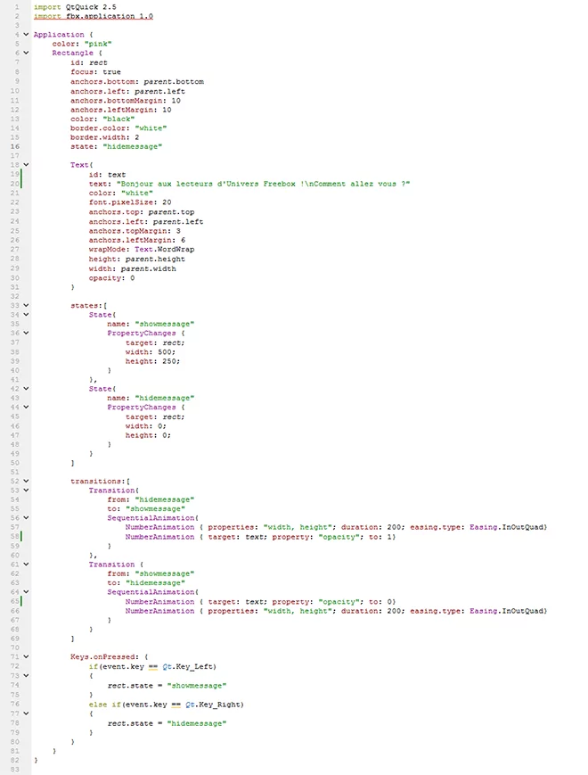 Nous souhaitons mettre ici notre rectangle en bas à gauche de notre écran. On utilisera pour ceci anchors.bottom : parent.bottom et anchors.left : parent.left pour ancrer notre rectangle en bas à gauche de son parent (Application). Puis anchors.bottomMargin : et anchors.leftMargin : pour définir à quelle distance (en pixel) du bas et de la gauche du bord de l’écran, nous souhaitons placer ce rectangle. On lui ajoute ensuite une couleur de fond ainsi qu’une bordure blanche de 2 pixel d’épaisseur avec border.color : white et border.width : 2. Pour finir, on lui ajoute un état "hidemessage" qui sera défini un peu plus tard.