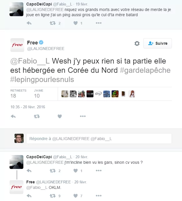 Twitter peut aussi être une source de conflits sur internet. En témoigne les propos de ce Freenaute qui, mécontent de voir son ping un peu trop haut lors d’une partie en réseau, en a profité pour insulter l’opérateur sur son compte Twitter. Insultes auxquels le community manager de Free n’a pas hésité à répondre, non sans humour.