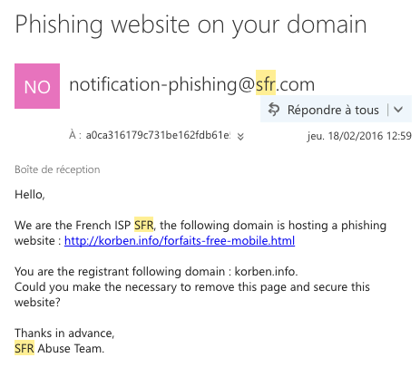 Korben assure sur son site internet qu’il n’a trouvé « aucun formulaire ou truc bizarre destiné à faire du phishing » sur la page en question. Une information confirmée hier par SFR sur Twitter qui a récemment répondu au blogueur en affirmant que le problème venait d’une image hébergée sur le site de Korben qui a servi pour un mail de phishing. Une histoire qui finit bien donc pour Korben, qui a seulement subi un dommage collatéral à cause de cette tentative malveillante de phishing.