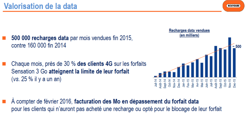 Et c’est bien ce que confirme le slide, sur la page intitulée "Valorisation de la data" (un titre qui annonce déjà la couleur), publié par Bouygues ce matin à l’occasion de la publication des résultats. Il est ainsi expliqué que 30% de leurs clients 4G atteignent le plafond de leur forfait Sensation 3Go, alors qu’il n’était que 25% un an auparavant. Idem pour la vente de recharges qui a explosé passant de 160 000 fin 2014 à 500 000 fin 2015. Conclusion : « A compter de février 2016, facturation des Mo er dépassement du forfait data pour les clients qui n’auront pas acheté une recharge ou opté le blocage de leur forfait ». Il s’agit donc bien de monétiser les dépassements ou vendre de recharge et donc de faire payer davantage les abonnés.
