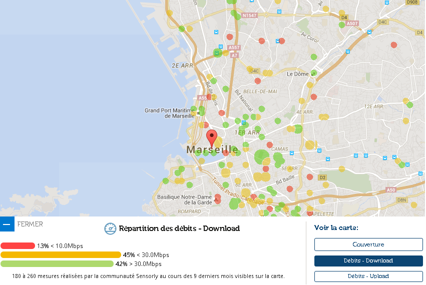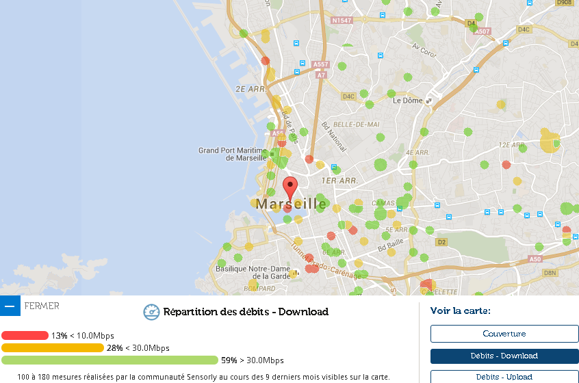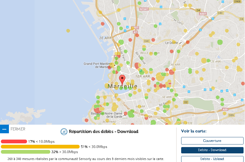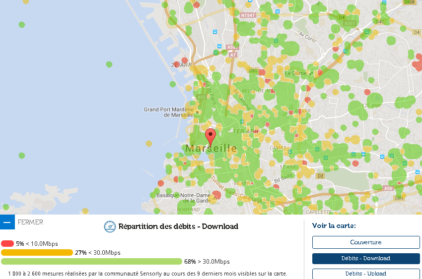 Les chiffres annoncés par Open Signal englobent tous les opérateurs, mais comme le fait remarquer François Trente Trois sur Twitter, grâce aux cartes de notre partenaire Sensorly on peut se rendre compte de quels opérateur tirent les débits vers le haut à Marseille, et ceux qui les tirent vers le bas.