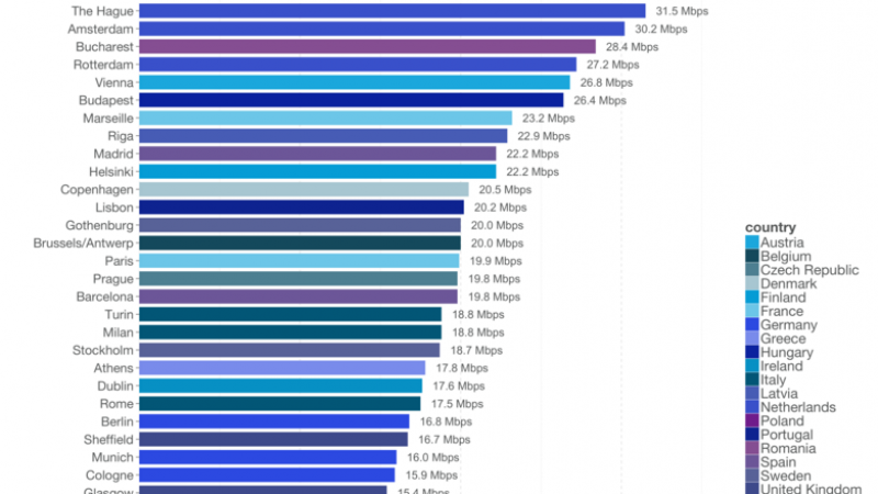 La première européenne est La Haye, avec un débit 4G moyen de 31,5 Mbps et la première ville française se trouve en 7ème position. Il s’agit de Marseille, avec un débit 4G moyen de 23,2 Mbps. La seule autre ville française présente dans le classement est Paris à la 15eme place avec un débit de 19,9 Mbps.
