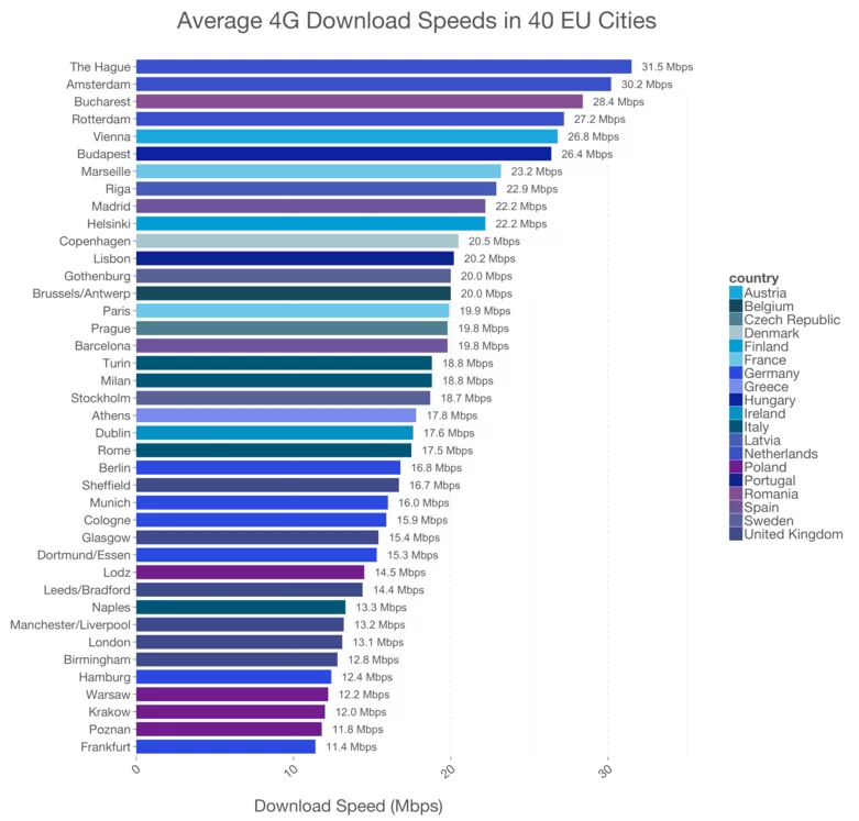 La première européenne est La Haye, avec un débit 4G moyen de 31,5 Mbps et la première ville française se trouve en 7ème position. Il s’agit de Marseille, avec un débit 4G moyen de 23,2 Mbps. La seule autre ville française présente dans le classement est Paris à la 15eme place avec un débit de 19,9 Mbps.