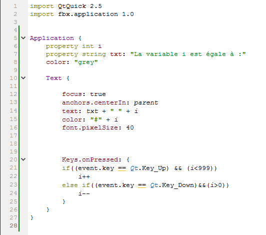 On commencera par créer deux variables. Un nombre entier que l’on déclare avec property int. Et une variable texte avec property string, qu’on initialise avec la phrase "La variable i est égale à :".