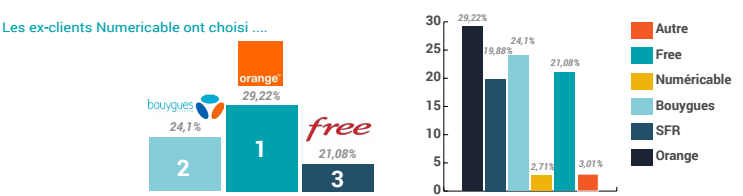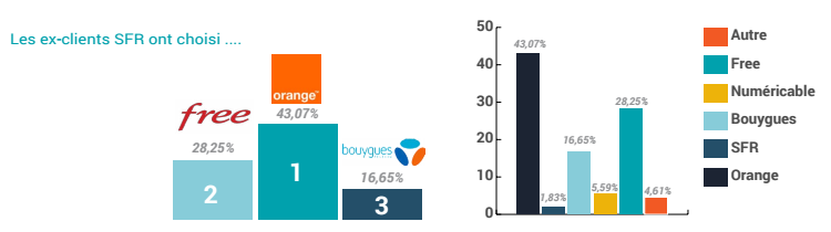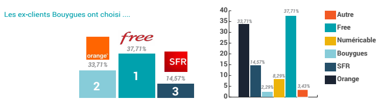 Cette étude nous permet également de savoir quels FAI ont choisi les ex-abonnés d’Orange, Bouygues Télécom, SFR ou Numéricable en 2015. Et parmi ces opérateurs, deux envoient leurs ex-clients majoritairement vers Free. Il s’agit d’Orange et Bouygues Télécom. Chez SFR et Numéricable, les ex-clients box choisissent en priorité Orange. Pour rappel, chez Free également, les ex-Freeanutes choisissent Orange.