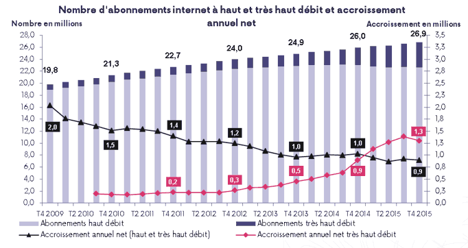 1,2 million d’autres abonnements à très haut débit dont le débit est supérieur ou égal à 100 Mbit/s, dont les accès en fibre optique avec terminaison en câble coaxial ; leur nombre s’accroît de 65 000 en un trimestre et de 34% en un an ;