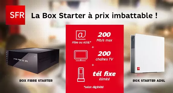 En effet, l’offre de SFR propose La Box Starter (fibre ou ADSL) à 8,99€/mois +3€/mois pour la location de la box, soit 11,99€/mois durant 1 an puis 39,99€/mois (dont 3€ de location de la box).