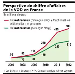 Pesant à peine 17 millions d’euros en 2006 et 56 millions d’euros en 2007, la VOD commence enfin à être « une réalité en France », à l’heure où « le marché de l’audiovisuel semble s’essouffler », estiment les analystes de Wyman. Après un démarrage poussif, le marché de la vidéo en ligne devrait donc peser dix fois plus lourd dans cinq ans. « Nous prenons en compte non seulement la perspective de catalogues élargis – 2.500 films disponibles en ligne aujourd’hui en France -, mais aussi le gisement de croissance lié à l’amélioration de l’ergonomie d’utilisation et aux fonctionnalités additionnelles, telles que les outils de recherche par mots clefs intégrés à l’écran, les «playlists» partagées ou encore les avis et recommandations échangés entre utilisateurs », expliquent les deux auteurs de l’étude.