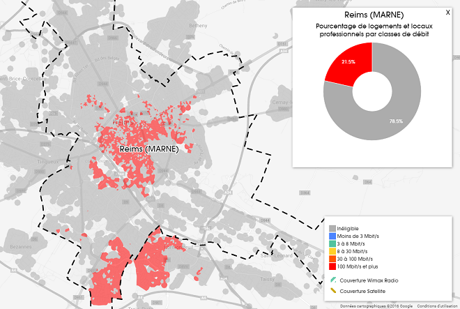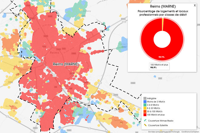 On voit sur la carte des déploiements DSL, Câble et FTTH que Reims est pratiquement couverte entièrement par le très haut débit, avec près de 99% des logements et locaux professionnels ayant un débit dépassant les 100Mbits/s.