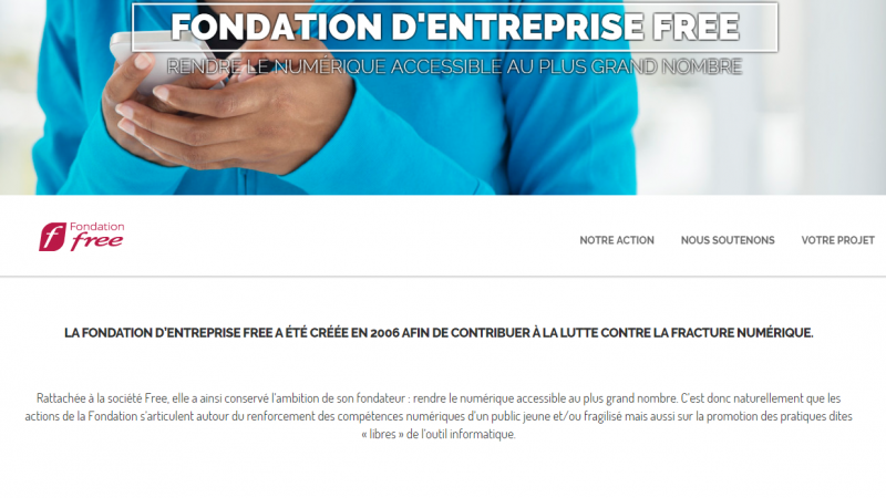 La Fondation d’entreprise Free a pour objet de réduire la fracture numérique. À cet effet, elle aide les personnes défavorisées et les organismes reconnus d’utilité publique à accéder aux services et à la technologie de l’Internet et à développer tous types d’actions s’y rapportant.