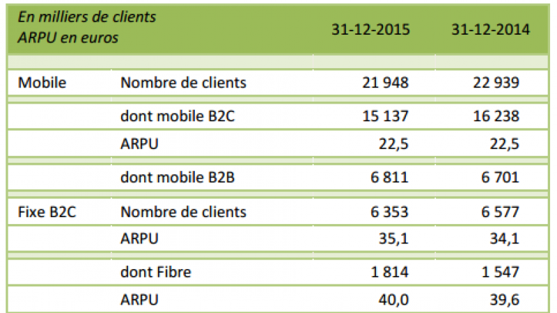 Sur l’année 2015, le Groupe a réalisé un chiffre d’affaires de 11,039 milliards d’euros en baisse de 3,5% par rapport à 2014. Cette baisse est pour l’essentiel due à l’érosion des revenus mobile tant dans le segment résidentiel que dans le segment de l’entreprise. Ce résultat confirme le ralentissement de la baisse du chiffre d’affaires par rapport à l’année 2014 au cours de laquelle la baisse du chiffre d’affaires du Groupe atteignait 5% par rapport à l’année 2013.