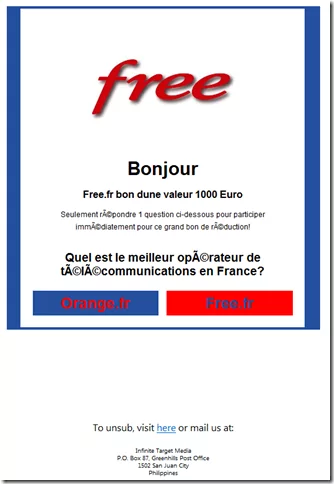 Un mail sous forme de concours, vous proposant d’indiquer qui de Free ou Orange est le meilleur opérateur télécom, est actuellement envoyé à des internautes. Il vous est promis, en échange de votre réponse à cette question, et dans un français plus que douteux, de « participer immédiatement pour ce grand bon de réduction »sondage permettant d’obtenir « une carte cadeau Free.fr d’une valeur de 1000 euros ». Attention, il s’agit d’une nouvelle arnaque visant les abonnés.
