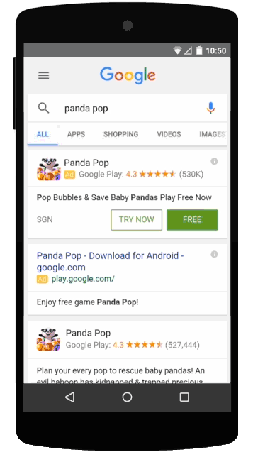 Comme l’indique Presse Citron, l’un consiste en un nouveau format publicitaire qui permettra à un utilisateur de tester un jeu vidéo depuis la page des résultats de recherches, sans avoir à l’installer. En appuyant sur un bouton « essayer maintenant », l’application se lancera en streaming depuis les serveurs de Google. Mais uniquement via un réseau Wi-Fi.