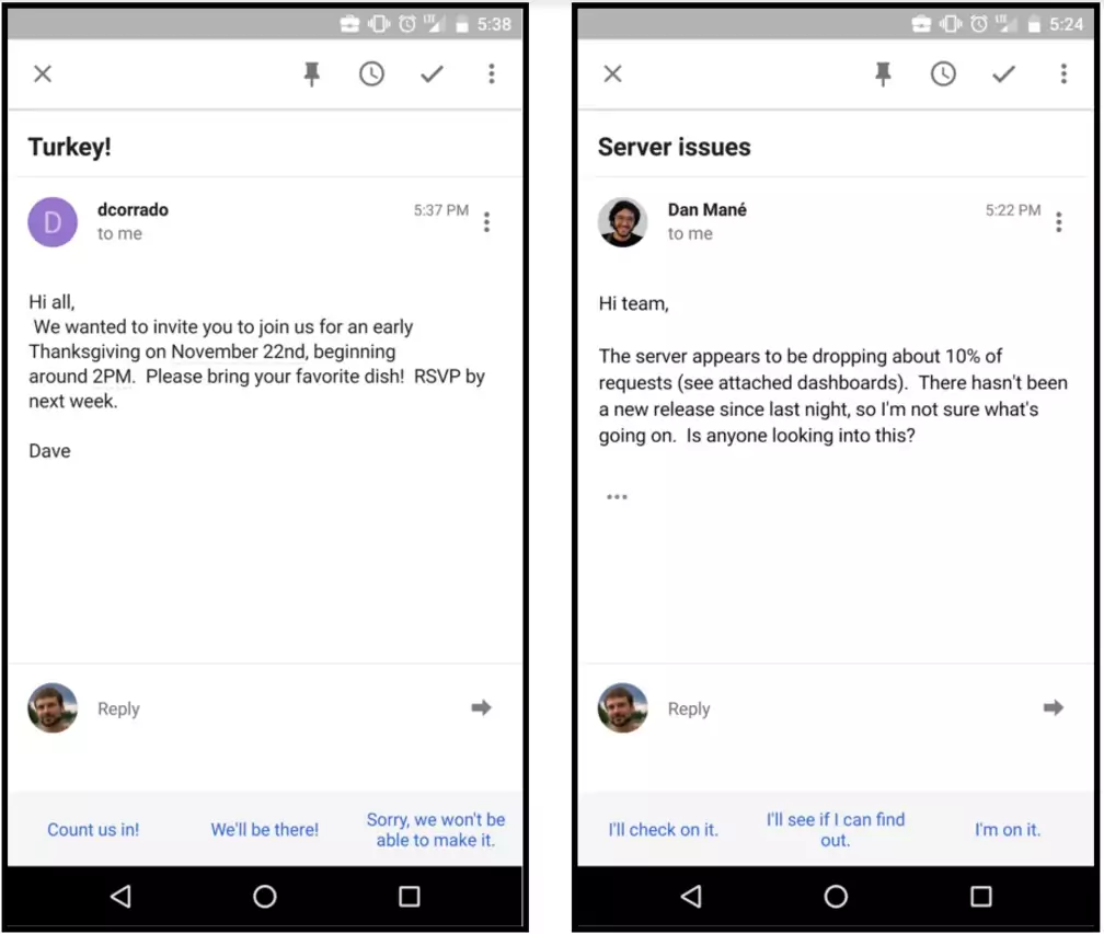 Smart Reply permet de créer des réponses courtes standardisées en analysant profondément le contenu de vos mails. Plus encore, le programme étudie votre style d’écriture et adapte ainsi ses propositions. Elle peut servir, par exemple, à valider en un éclair un rendez-vous, à le refuser ou à le reporter. Le contenu des mails reste éditable. Histoire de ne pas afficher un dédain trop robotique auprès de vos correspondants ?