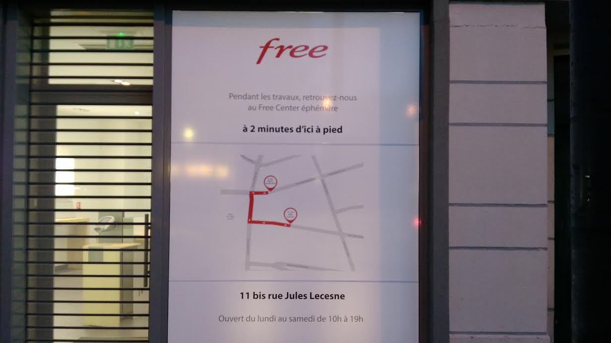 Le Free Center du Havre, situé 6 rue Albert André Huet, vient de fermer pour cause de travaux. Mais pas d’inquiétude cependant pour les Freenautes puisque Free a ouvert un Free Center éphémère à 2 minutes à pieds de là. Il sera ouvert durant toute la durée des travaux, de 10h à 19h, du lundi au samedi.
