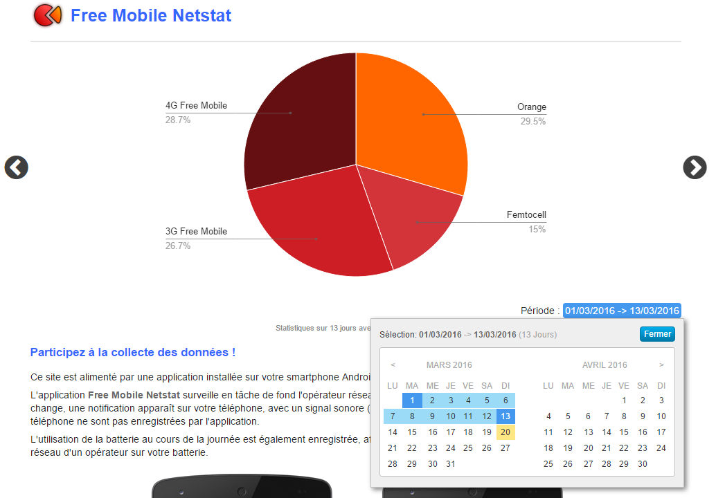 Toutes les informations récoltées par l’application sont ensuite diffusées sur site de Free Mobile Netstat à l’adresse : http://fm.netstat.fr, sur lequel vous pourrez consulter le pourcentage d’utilisation globale de chaque réseau, et ainsi découvrir l’étendue de la couverture de Free Mobile. Le nouveau site compile l’ensemble des résultats pour les présenter graphiquement. La couverture réseau est recalculée automatiquement chaque jour.