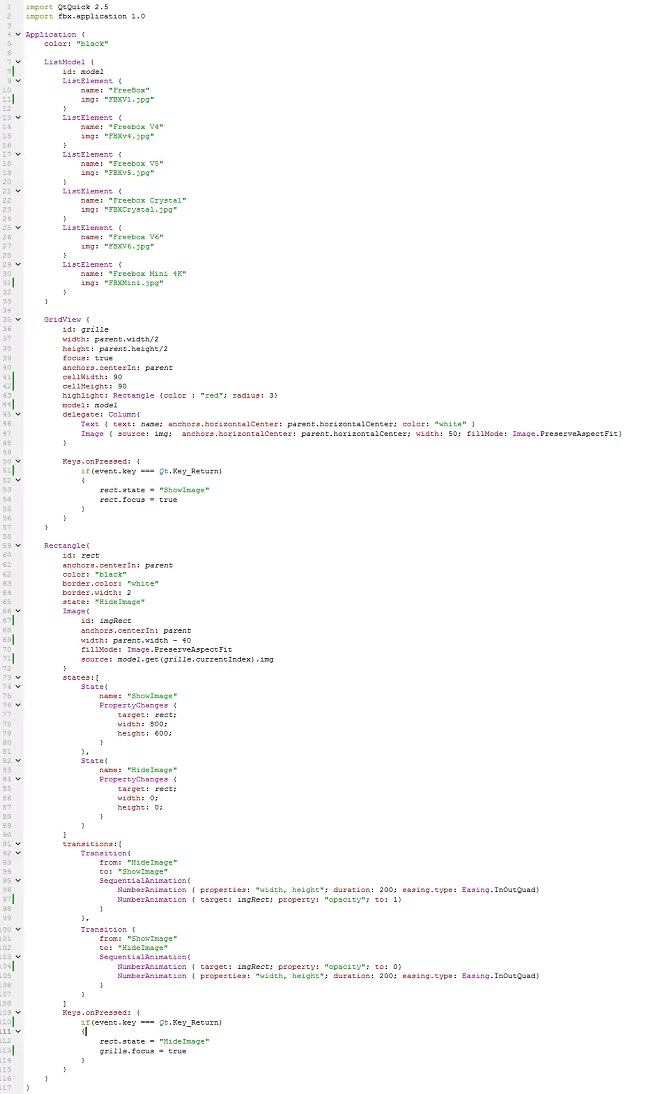Nous allons commencer par créer une grille d’éléments. Mais cette fois-ci, nous allons lui passer une image en plus d’un texte. Après avoir mis toutes les images voulues dans le dossier du projet, nous allons créer notre ListModel. Dans chacun des ListElement nous ajouteront un texte puis le nom exact de l’image avec son extension.