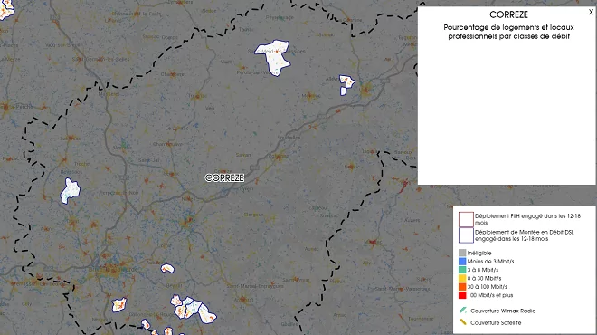 Seuls quelques déploiements sont actuellement engagés dans les 12-18 mois en Corrèze. Ces déploiements concernent uniquement une montée du débit DSL.