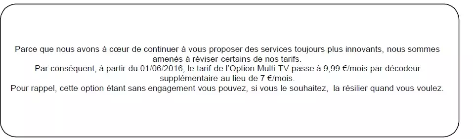 Depuis de nombreuses semaines maintenant, SFR revoit à la hausse une grande partie de ses tarifs. Et cette loi des séries ne semble pas être terminée puisque des abonnés ayant souscrit à l’option Multi TV viennent d’être informés que cette option passera de 7€/mois à 9,99€/mois à compter du 1 juin 2016, ainsi que le rapporte un abonné sur le site N9ws. Mais que les abonnés se rassurent, si il y a hausse de tarif, c’est « parce que [SFR-Numéricable] ont à cœur de continuer à vous proposer des services toujours plus innovants ».