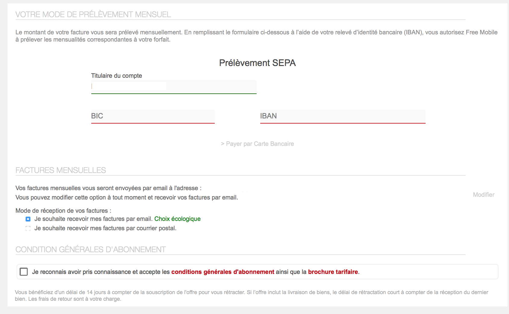 Enfin, l’abonné est invité à mettre en place ses coordonnées bancaires et à choisir la facture par mail ou par courrier.