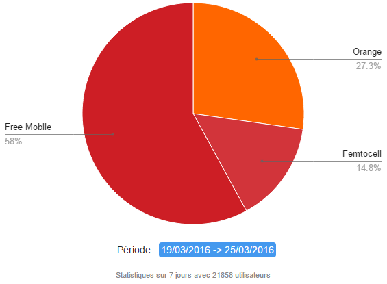 Par ailleurs, grâce aux contenus enrichis disponibles sur le nouveau site de Free Mobile Netstat, on découvre que le pourcentage d’utilisation du réseau 4G de Free atteint 29.7%, celui du réseau 3G de Free 26.3% alors que celui des Femtocell atteint 15.5% (contre 29.7% en 4G, 26.5% en 3G et 14.8% en Femtocell la semaine dernière). Ces résultats ont été obtenus sur une période de 7 jours (toujours du 19 au 25 mars 2016 avec 19 271 utilisateurs).