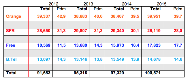 Hammett, bien connu pour ses différentes compilations de données chez les opérateurs télécom, vient de publier sur lafibre.info le comparatif des abonnés totaux chez les différents opérateurs, pour le mobile (prépayé et forfait) et pour le fixe de 2012 au T4 2015 avec la part de marché (pdm) correspondante.
