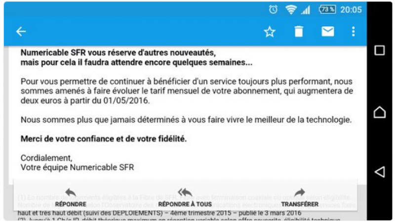 « Numericable SFR vous réserve d’autres nouveautés, mais pour cela il faudra encore attendre quelques semaines… Pour vous permettre de continuer à bénéficier d’un service toujours plus performant, nous serons amenés à faire évoluer le tarif mensuel de votre abonnement, qui augmentera de deux euros à partir du 01/05/2016 ».