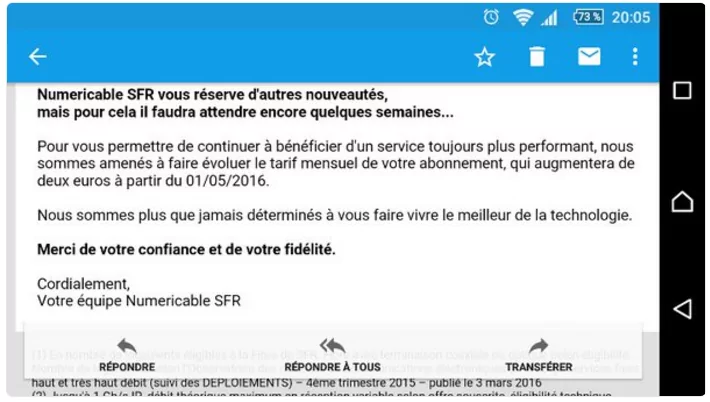 « Numericable SFR vous réserve d’autres nouveautés, mais pour cela il faudra encore attendre quelques semaines… Pour vous permettre de continuer à bénéficier d’un service toujours plus performant, nous serons amenés à faire évoluer le tarif mensuel de votre abonnement, qui augmentera de deux euros à partir du 01/05/2016 ».