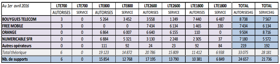 Au 1er avril 2016, l’ANFR a accordé ses premières autorisations de sites 4G dans la bande des 700 MHz à Bouygues Télécom (3 sites à Paris) et Free Mobile (3 sites à Tarbes). Leurs mises en service pourront intervenir à partir du 5 avril, date de transfert effectif aux opérateurs mobiles, pour les zones concernées, de cette bande jusque-là utilisée pour la TNT . Les opérateurs pourront déployer sur plusieurs territoires français à partir d’avril, puis plus tard et progressivement dans le reste de la France.
