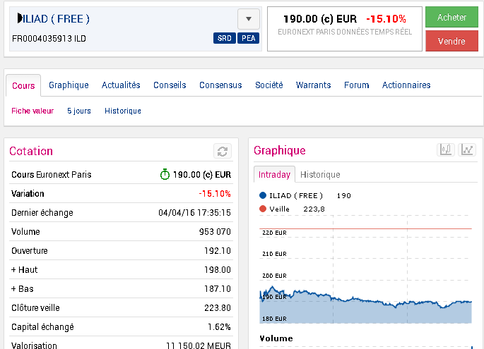 Et cette baisse est importante, à -15,10% pour le titre Iliad à la fermeture. L’action est ainsi passée de 223,80€ vendredi soir à 190,00€ ce lundi soir. Et Xavier Niel, actionnaire majoritaire est le plus impacté par cette baisse. Le journal du Net a calculé "le capital d’Iliad est composé de 58,684 millions d’actions, détenues à 54,70% par Xavier Niel, soit 32,1 millions d’actions pour le trublion des télécoms. La perte pour Xavier Niel s’établit donc à plus de 1,08 milliard d’euros."