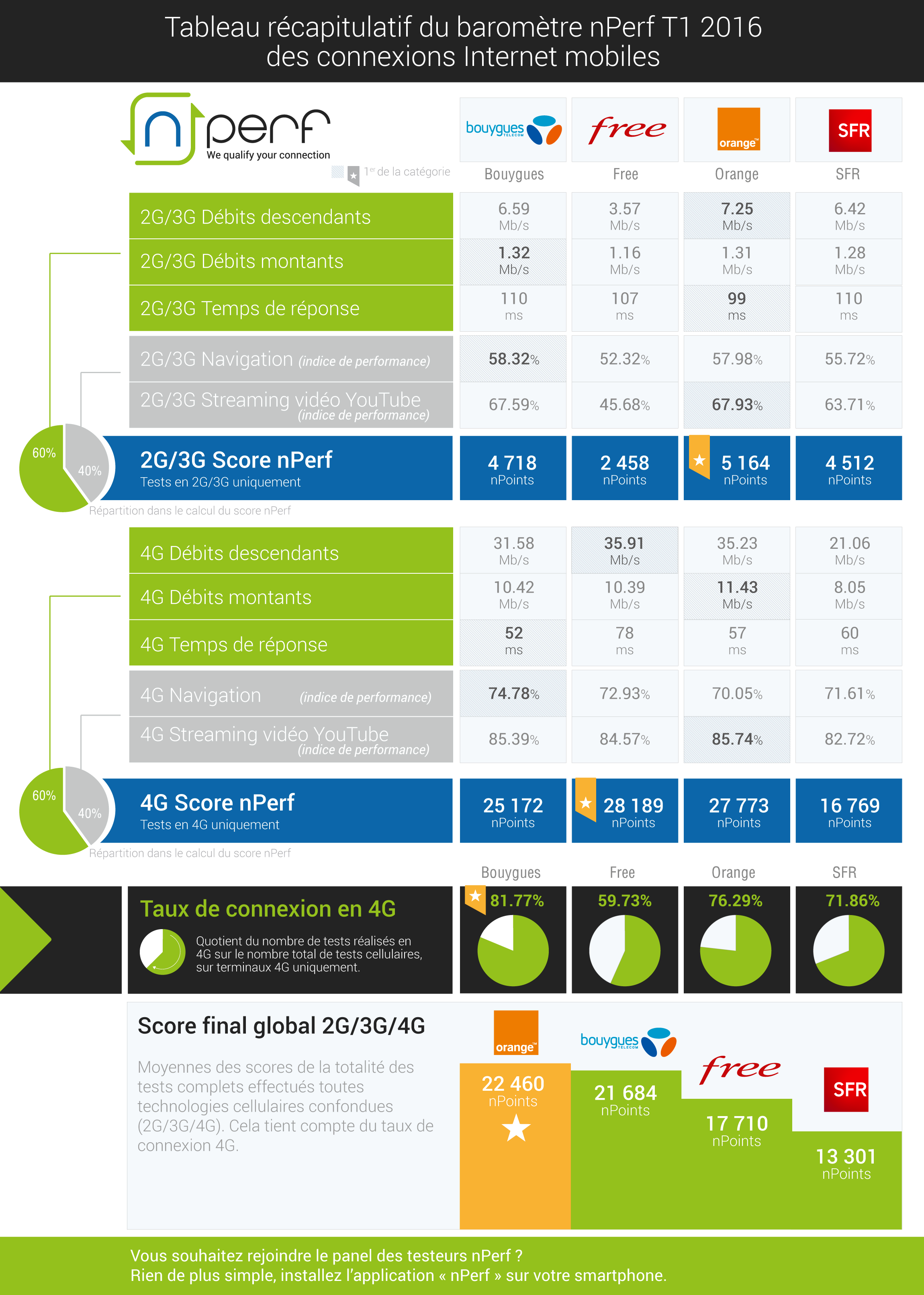 L’infographie de synthèse du baromètre mobile nPerf du 1ier trimestre 2016 :