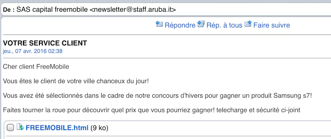 C’est ainsi que Charlie, un lecteur d’Univers Freebox, nous alerte sur un mail frauduleux envoyé actuellement. Il annonce que le réceptionnaire du mail serait le gagnant du jour, de sa ville, du fameux concours d’hiver (saison qui est terminée depuis 2 semaines) organisé par Free Mobile pour remporter un produit Samsung. Free Mobile organiserait donc un concours qui ferait gagner un produit Samsung chaque jour et dans chaque ville, une chose vraiment très crédible.