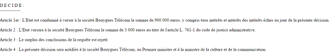 Ce décret devait être publié logiquement dès la création de la haute autorité et de la loi éponyme en 2009. Au plus tard quinze mois plus tard. Il ne le fut jamais : le Conseil Constitutionnel avait condamnée cette aberration de l’État en décembre 2015. C’est finalement ce lundi 4 avril que le juge administratif a tranché : 37,5 centimes par adresse IP pour un total de 900 000 euros en faveur de Bouygues Telecom.
