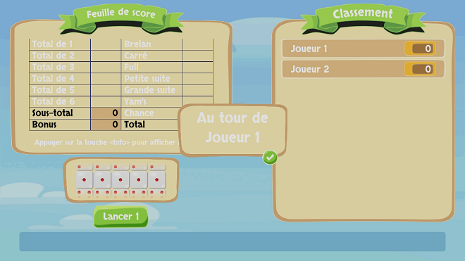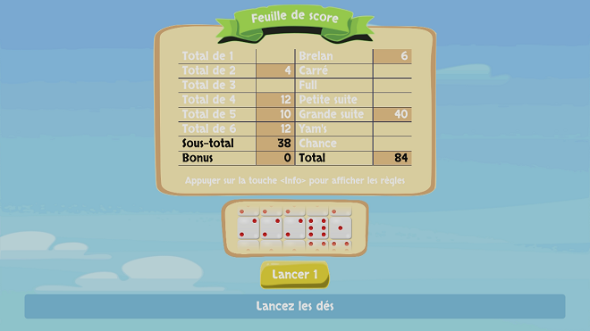 Le Yam’s est un jeu de dés où vous devrez lancer 5 dés. A chaque lancé, vous pourrez choisir de conserver certains et relancer les autres. Vous devrez atteindre le score le plus élevé en fonction des différentes combinaisons de dés.