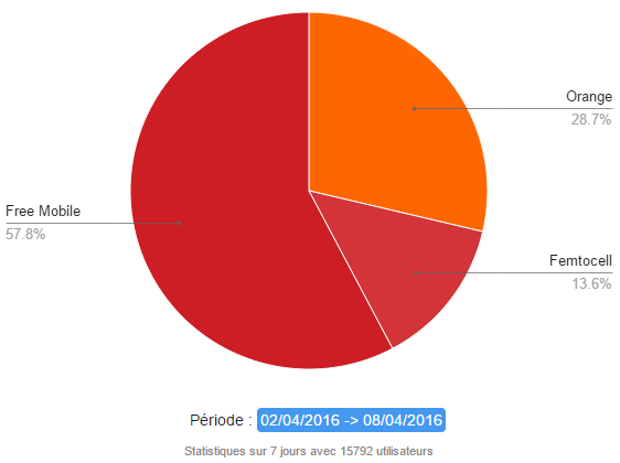 Par ailleurs, grâce aux contenus enrichis disponibles sur le nouveau site de Free Mobile Netstat, on découvre que le pourcentage d’utilisation du réseau 4G de Free atteint 28.9%, celui du réseau 3G de Free 26.9% alors que celui des Femtocell atteint 14.2% (contre 28.7% en 4G, 27.4% en 3G et 15.5% en Femtocell la semaine dernière). Ces résultats ont été obtenus sur une période de 7 jours (toujours du 02 au 08 avril 2016 avec 13 813 utilisateurs).