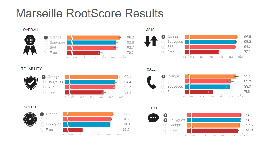 Pour son arrivée en France, RootMetrics a publié ses deux tests réalisés à Paris et Marseille. Dans ces deux villes, Orange arrive en tête du classement et Free dernier. Sur Paris, ce sont 2 personnes qui ont réalisé des tests durant 6 jours.