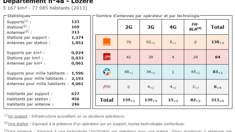 Univers Freebox vous propose, via le site Couverture Mobile, un tableau comparatif du nombre d’antennes déployées dans la Lozère, par les différents opérateurs.