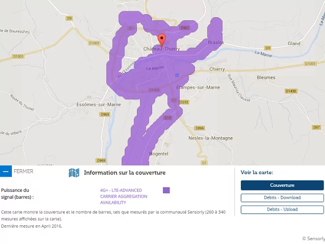 Comme l’annoncé Mizukals sur Twitter. La 4G+ de Free Mobile est désormais présente sur la ville de Château-Thierry. Vous pouvez aider les autres freenautes à compléter la carte grâce à l’application de notre partenaire Sensorly.