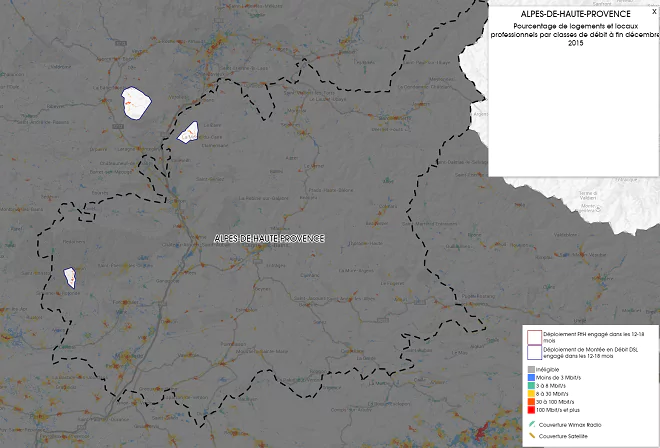 Seules deux zones sont actuellement concernées par un déploiement engagés dans les 12-18 mois dans les Alpes de Haute Provence. Ces déploiements concernent tout les deux une montée du débit DSL uniquement.