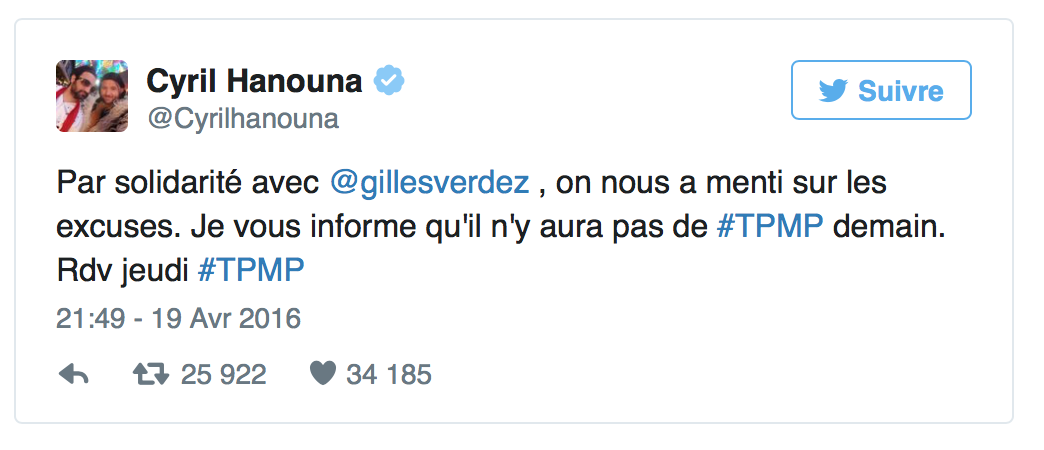 Cyril Hanouna vient d’annoncer sur son compte Twitter qu’il annulait le TPMP de demain avec Nabilla en invité en solidarité de son chroniqueur. Quant aux internautes, ils demande actuellement le renvoi de Joey Starr.