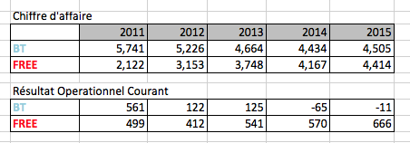 C’est ce que l’on peut constater sur le comparatif publié par Hammett sur lafibre.info, qui montre que depuis 2011, le chiffre d’affaires de Bouygues Télécom a baissé régulièrement, avec une légère remontée pour la première fois en 2015. A l’inverse, le chiffre d’affaires de Free a continuellement augmenté, et même doublé depuis 2011. Malgré tout, le chiffre d’affaires de Bouygues Télécom reste légèrement supérieur à celui de Free sur l’exercice 2015.