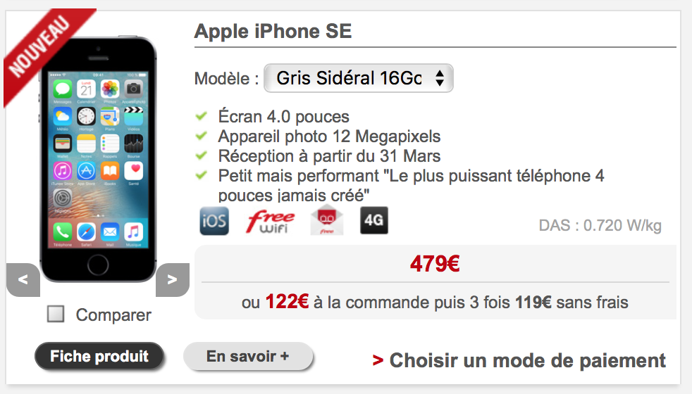 Plus surprenant, le prix de l’iPhone 5S en vente sur le site est exactement le même que celui du petit dernier, l’iPhone SE 16 GO : 479€. Entre les deux modèles, l’iPhone SE a de bien meilleurs caractéristiques puisqu’il dispose d’un processeur A9 au lieu de A7 et d’un capteur photo de 12 mégapixels au lieu de 8.