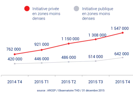Un bilan du déploiement du FTTH dans les Zone moins dense a également été publié lors de la présentation du bilan des RIP la semaine dernière. Outre le déploiement des opérateurs privés on constate une accélération de la mise en exploitation des prises FTTH issues des RIP (+ 53 % sur l’année 2015) en zones moins denses